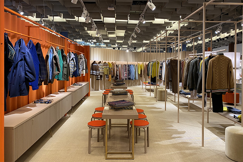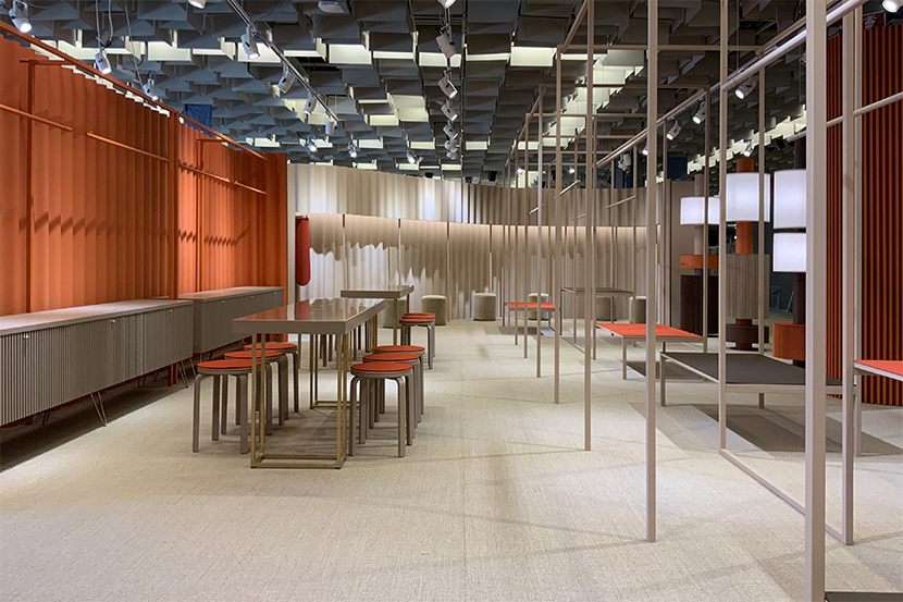 The space expands and runs along the undulating and degradé walls in a palette of neutral and warm colours with orange accents in a balanced distribution.