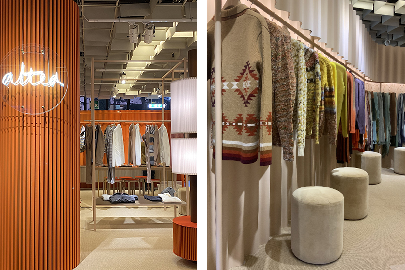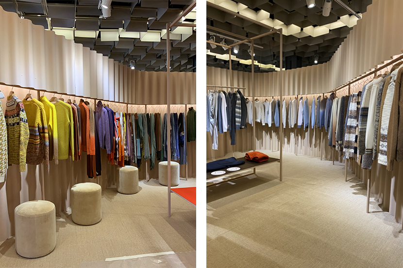 The pieces on display underscore the fluid trend of the space, entering like an uninterrupted coloured wave along the side walls,