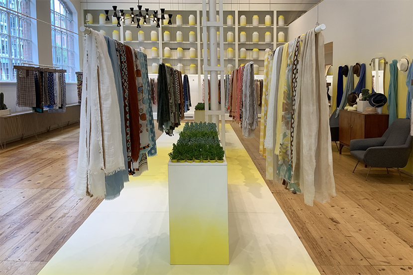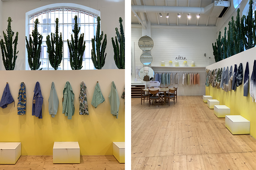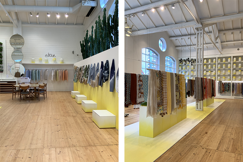 The mood of the collection speaks of nuances, evanescence and lightness. Everything seems to fluctuate in the display where the yellow of the surfaces disappears into white, the colour of the summer. The walls become a curtain with an undulating and regular geometry thanks to sheets of painted fibreglass with an opaque finish. Degradé yellow accompanies the white of the floor and the structure holding the hanging area at the centre of the stand. The whole is anchored by large cacti which filter the view and create a wall, a threshold to be crossed.