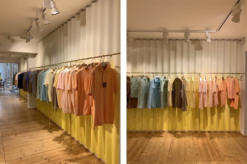 Neon-coloured sweatshirts are suspended here while in the showroom they are displayed against wallpaper reproducing various styles of murals.