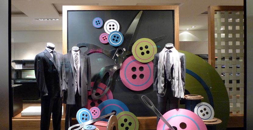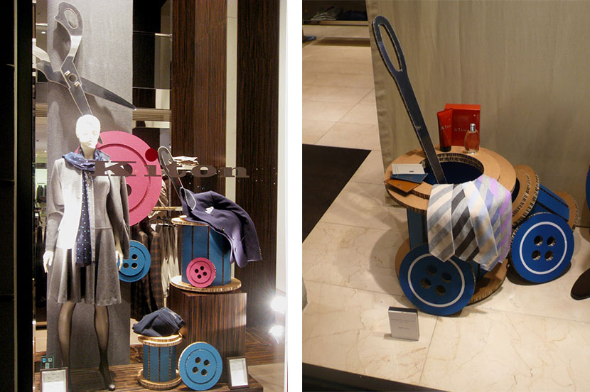 A project conceived and produced for the Hamburg, London, Munich, Venice and Rome stores. A set design for store windows on several levels interprets the theme of luxury tailoring and focuses on enormous tailoring tools simulating other materials, such as wood and metal, without ever hiding the cardboard. The result has a high impact and is fully in line with the brand’s values. The material for the window-dressing is supplied flat in manageable packs, with great savings in transport and storage costs. Assembly requires a few hours of work and is carried out directly by the sales personnel.
