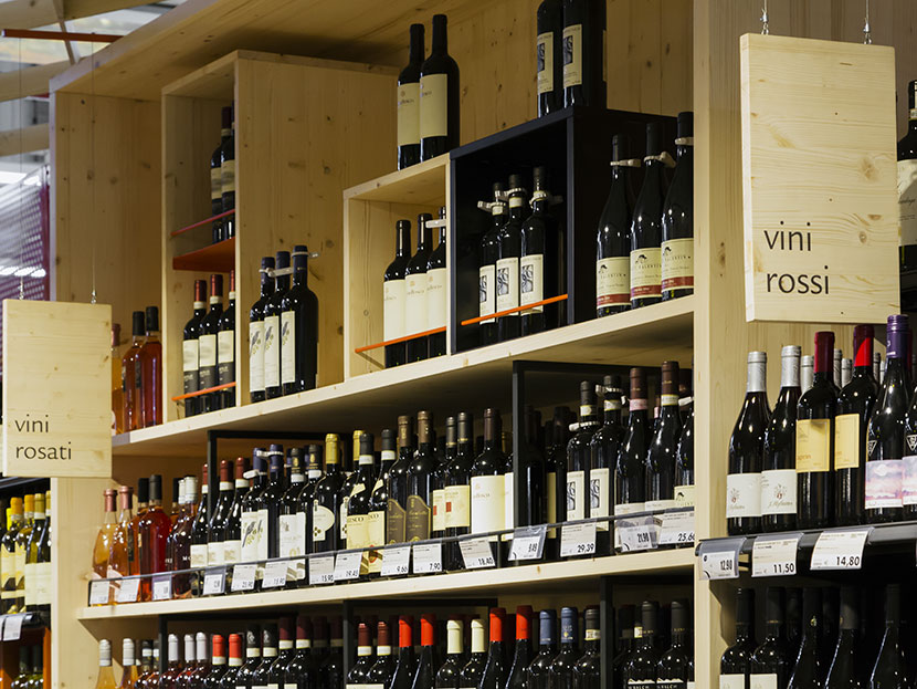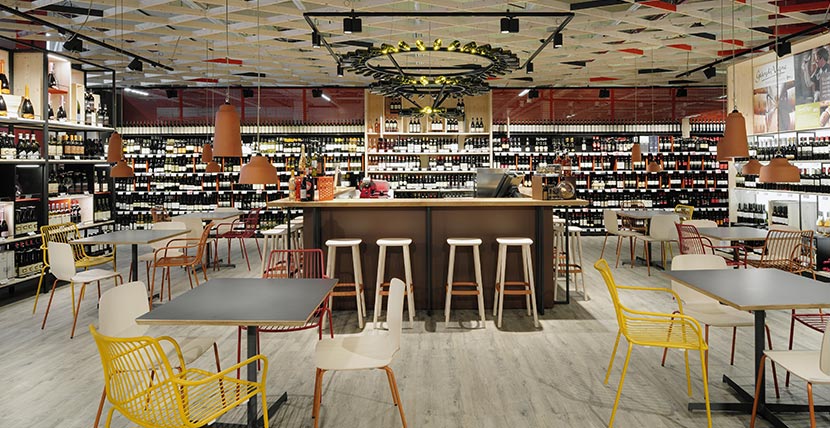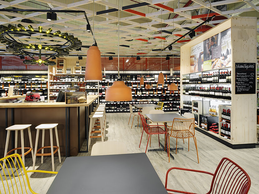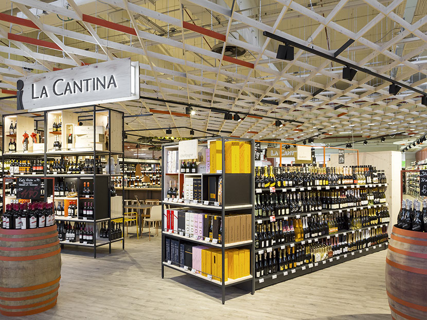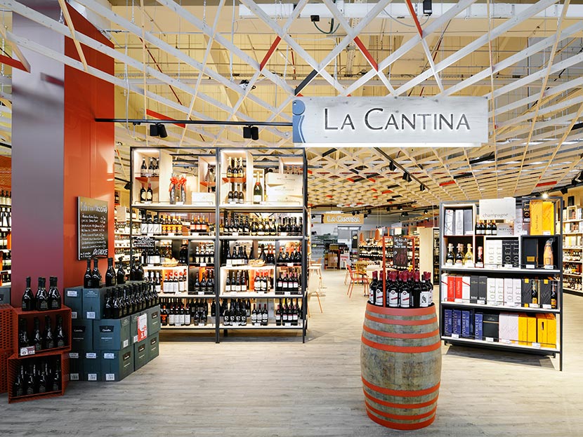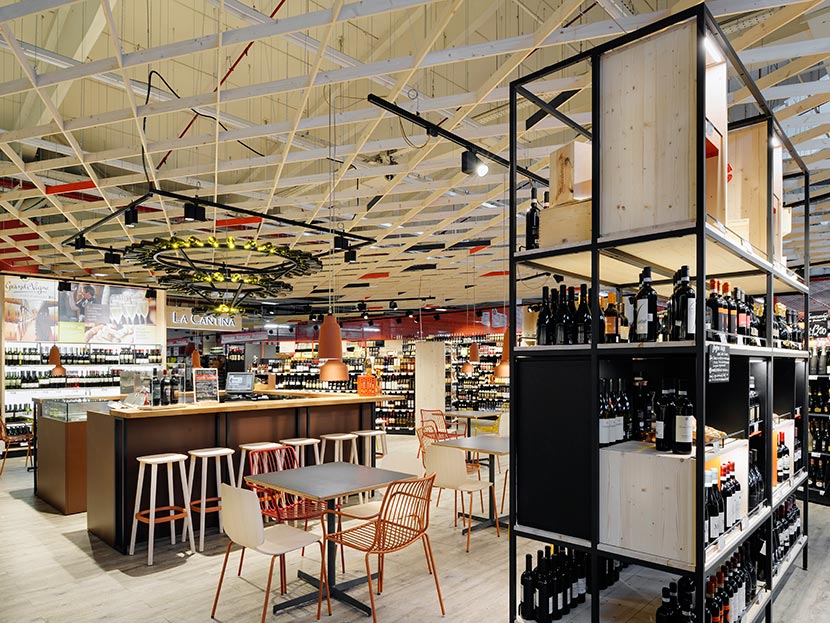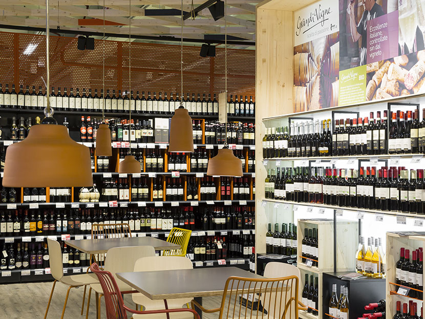 Development of a new concept for the area for tastings/purchase of wine and selected products. The project defines the space, ensures smooth customer flow and creates a protected section, lying outside the passage of trolleys. The image of the new area, as an extension of the values of the brand and the product, is conveyed by the choice of unsophisticated natural materials (wood, terracotta and iron), the refined colour palette and the custom-designed lighting together with the furnishings.