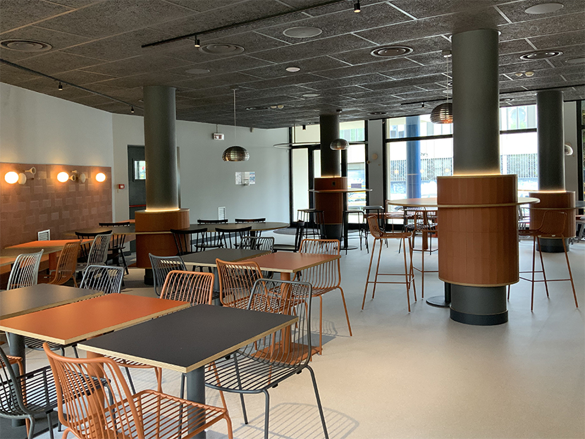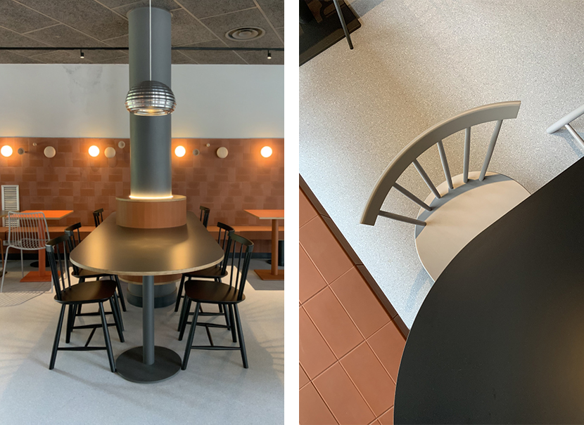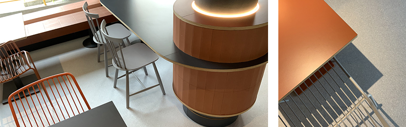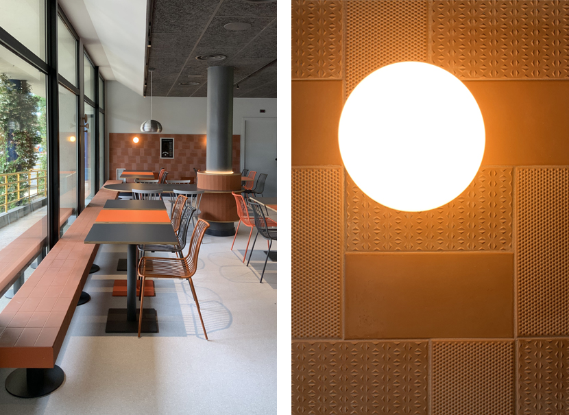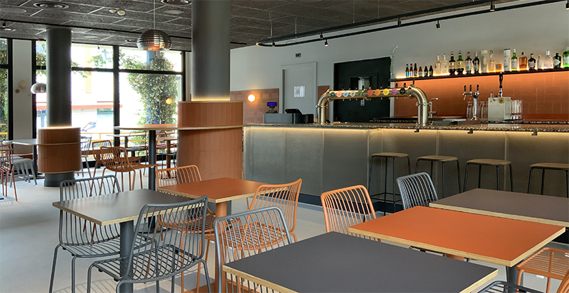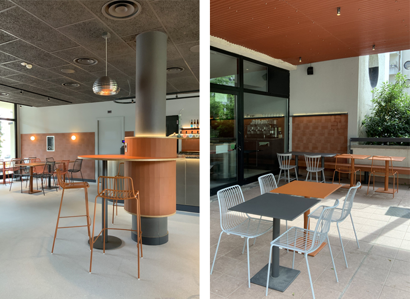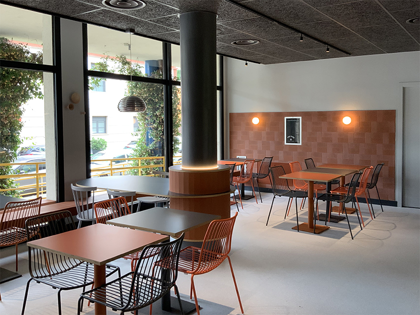 Common materials, more associated with workplaces, are used, such as PVC for the floor, perforated steel sheeting and grit for the bar, wood with laminates for the tables,