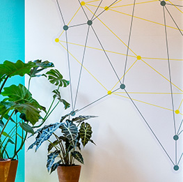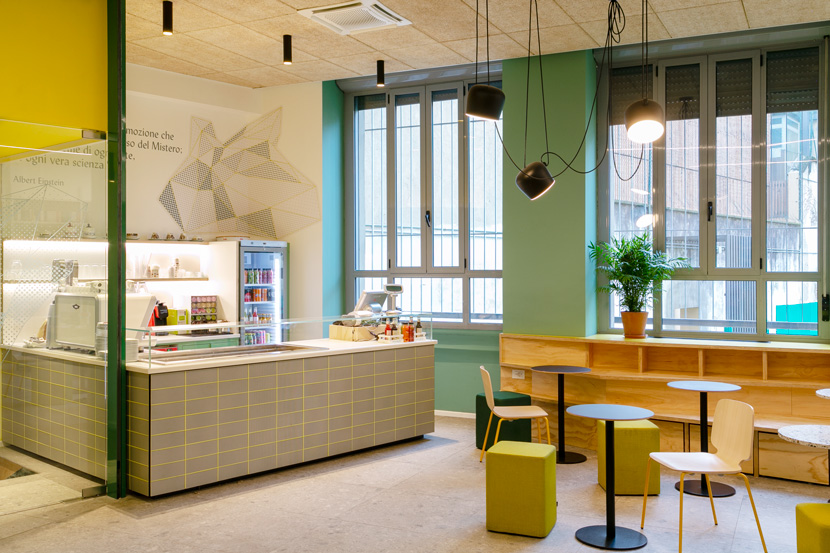In the palette, green tinged by light blue is accompanied by neon yellow. Natural materials such as veined wood and marble chip have been used. On the walls are quotations by great men in a large format.