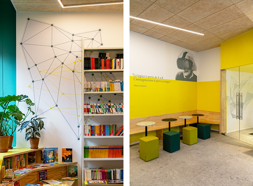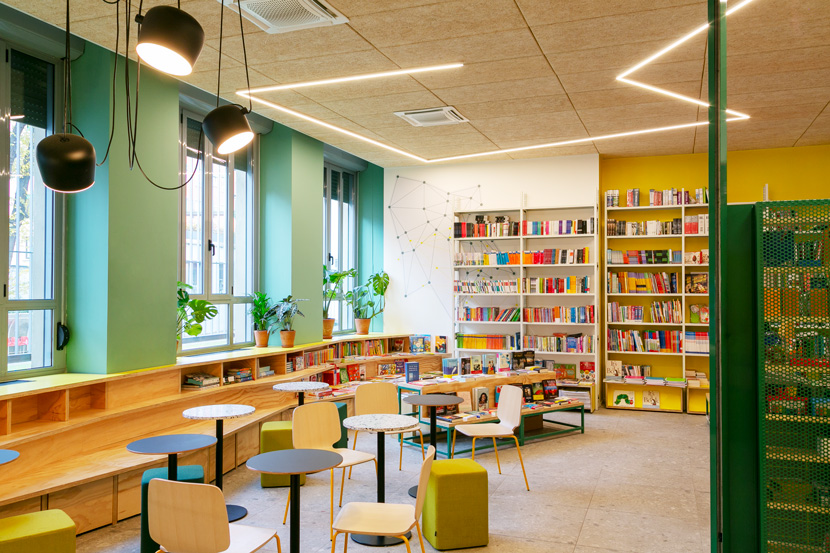 Like a fluid landscape, it changes layout thanks to the nomad furnishings which not only move when necessary but also change their function. The display for books becomes a small stage for the guests of talks, the low fragmented bookcase, seating for the public.
