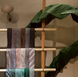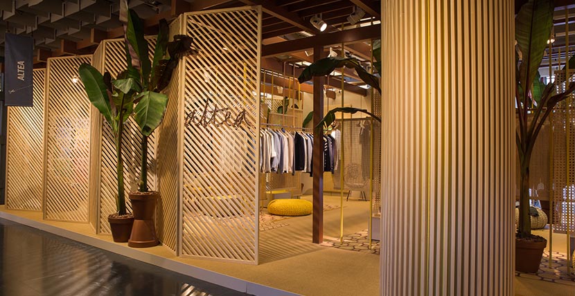 For the 112 sq. m. stand, the mood of inspiration is a home overlooking the sea with influences from the Scandinavian world. The project aims at visual permeability, brightness and transparency. Natural materials such as untreated wood and woven straw have been used and, to characterize the stand, vintage furniture, printed paper fabric rugs, cottons with Nordic floral patterns and large banana trees, kentia palms and cacti.