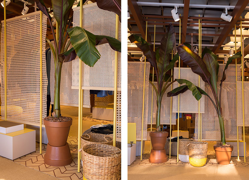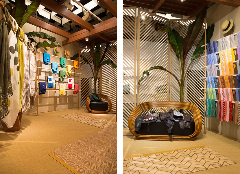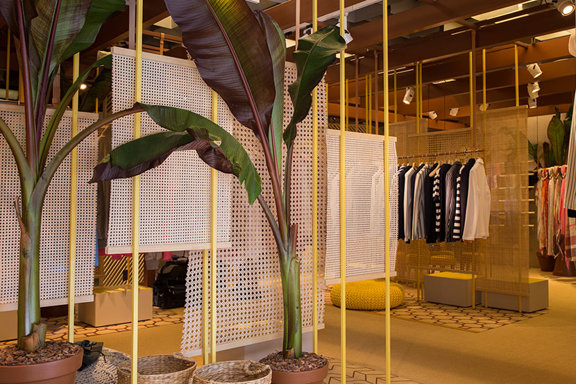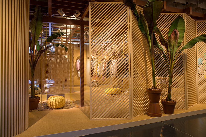 spatiality. Light walls with slender yellow iron uprights and panels of woven straw act as backdrops to the various outfits. The paper rugs overlay geometric patterns in warm hues.