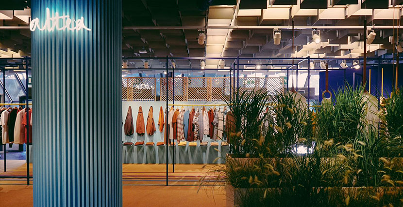 green background: cool, summery and relaxing. The outfits are mounted on vertical rods