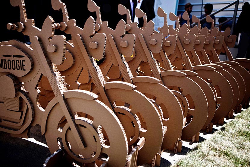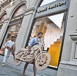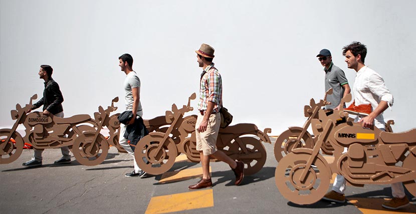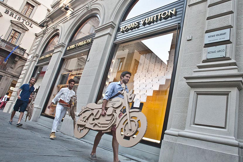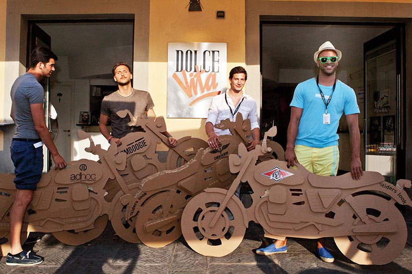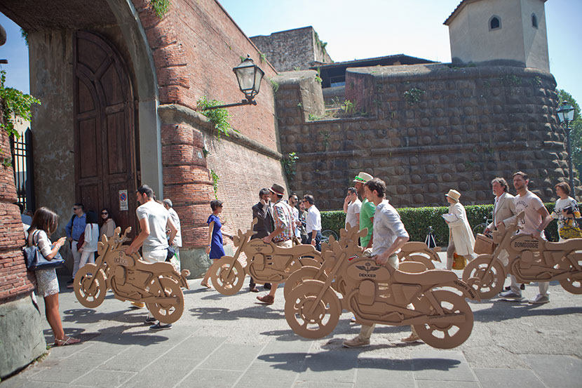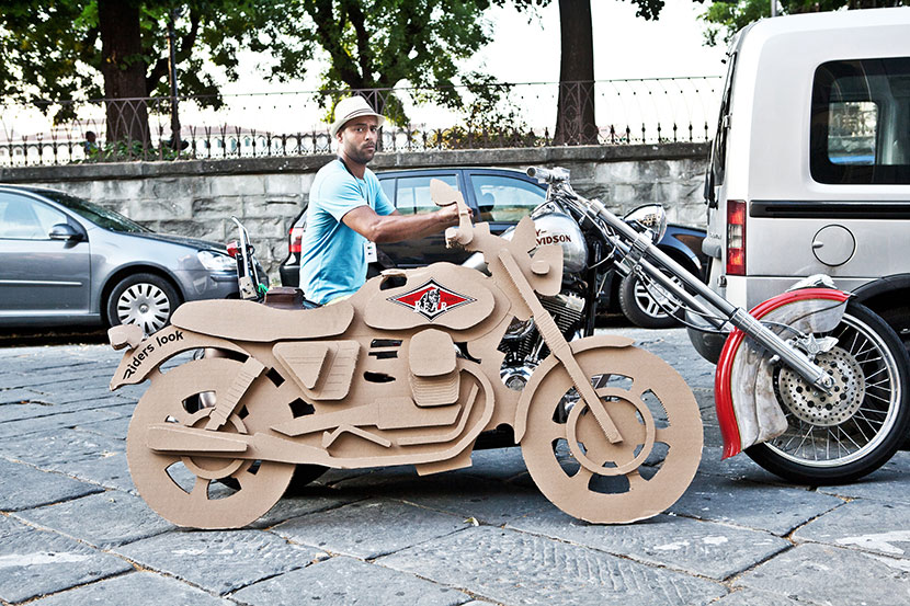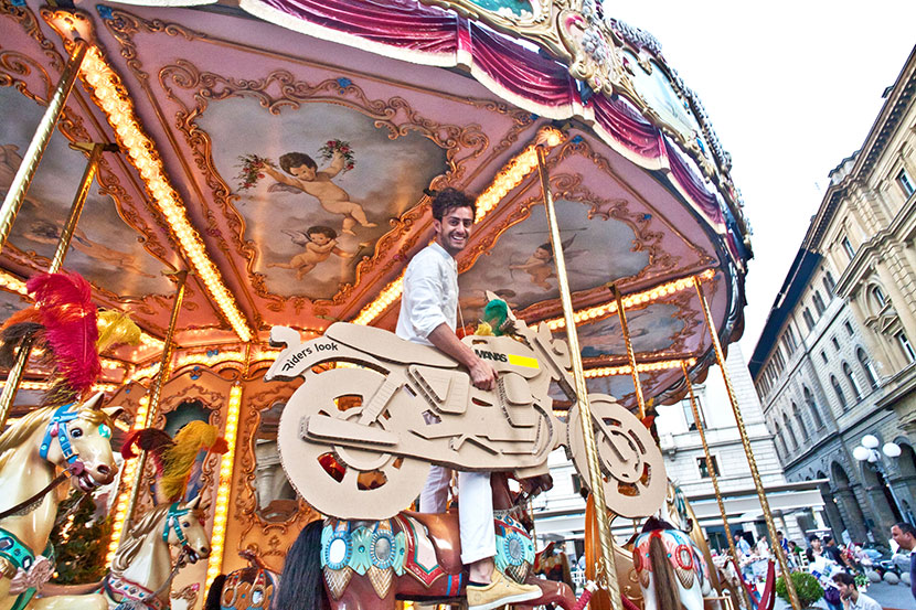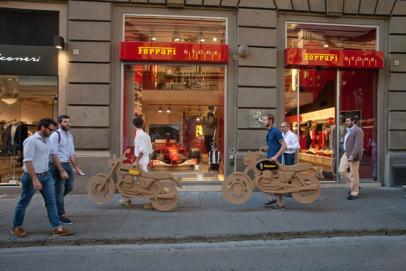 The creation of a fleet of inexpensive and ecological cardboard motorbikes personalized with the logos of seven fashion brands for the event organized by the specialised magazine Riders. The motorbikes, which are ridden by models ready for the catwalk, are free to buzz around the old city centre on footpaths and merry-go-rounds and even inside buildings and commercial premises.