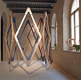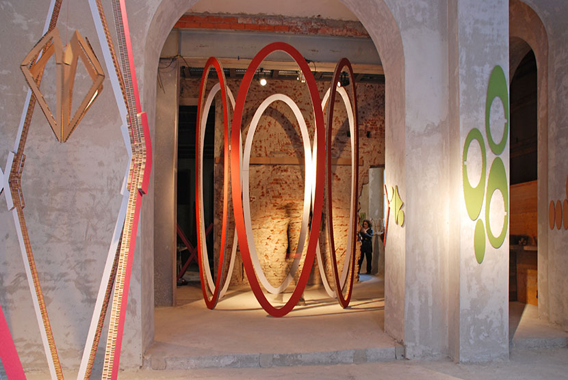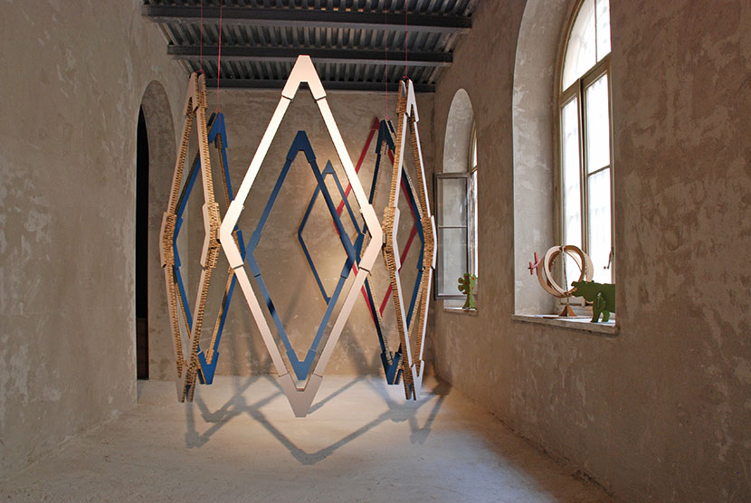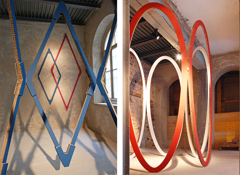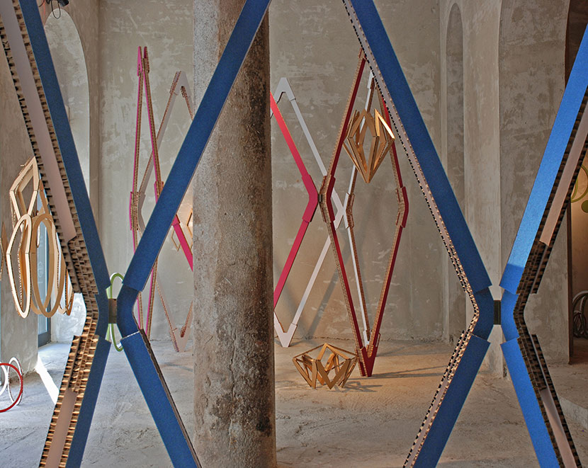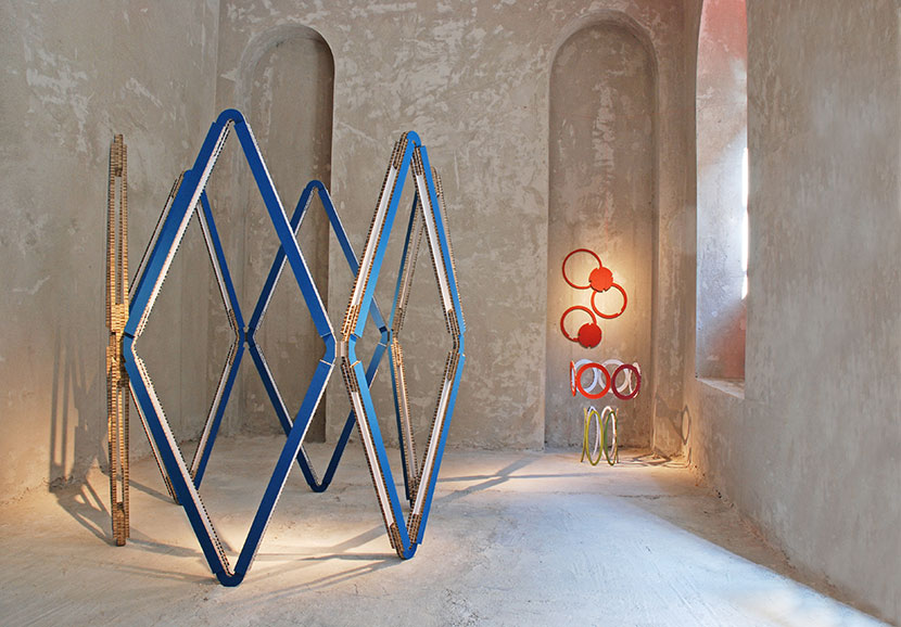 Lines, parts, colours. Not yet an object. Exercises in form on the theme of the lozenge, and references to Milanese architecture of the 1930s. Curved two-dimensional elements become threedimensional. From being macro to micro dimensions, they morph into spaces you can enter (light pavilion-like structures) or into decorative forms inspired by simple figures like ellipses, circles and, of course, lozenges. The light and striking material is honeycomb cardboard.