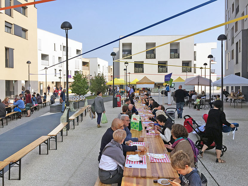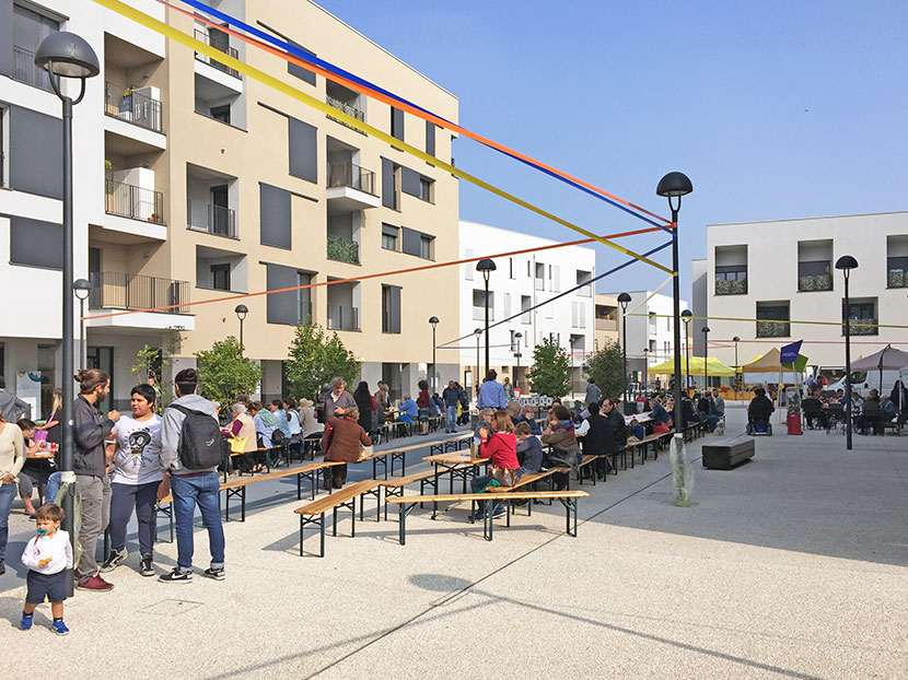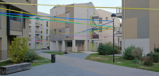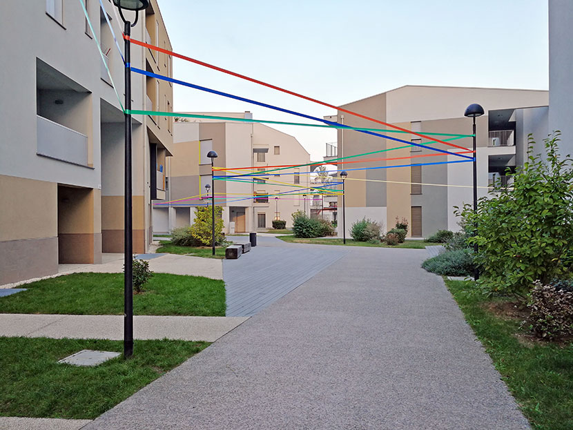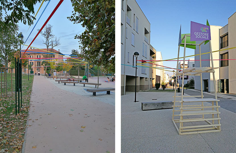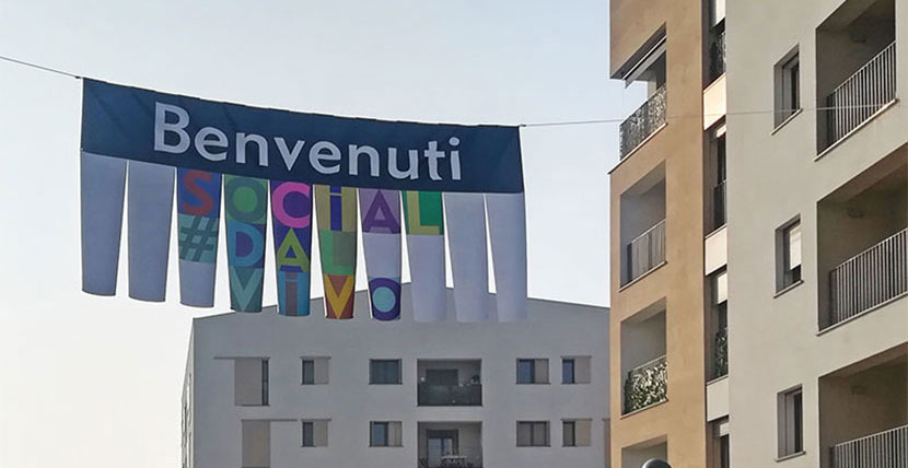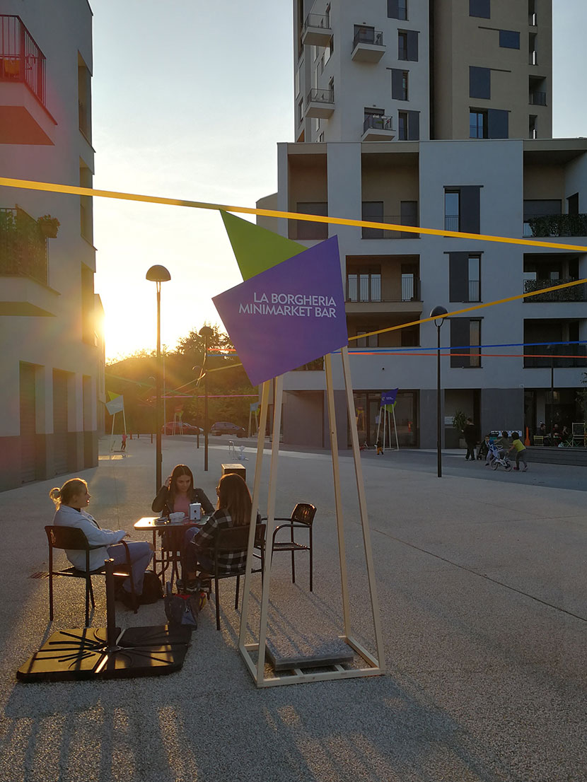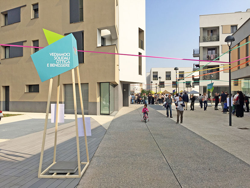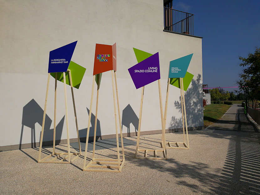 For the open day of the neighbourhood built up on an idea of community and interaction, light and playful signage, conceived not only to brighten up the new Milanese area but also to indicate the main places, the common areas and those that host the many appointments of the event. The sustainable temporary layout, destined to remain longer than one day, used natural fir and is inspired by the pop colours of the logo-claim. It consists of a gazebo-infopoint and 14 totems with signage crowners, a welcome banner and coloured ribbons underlining the values of sociality and sharing.