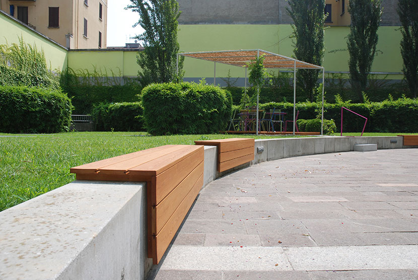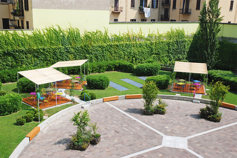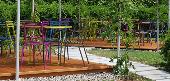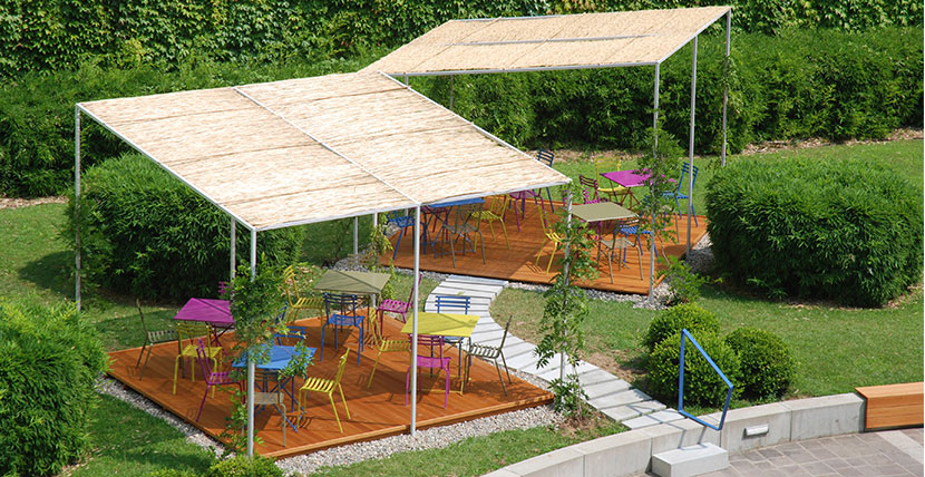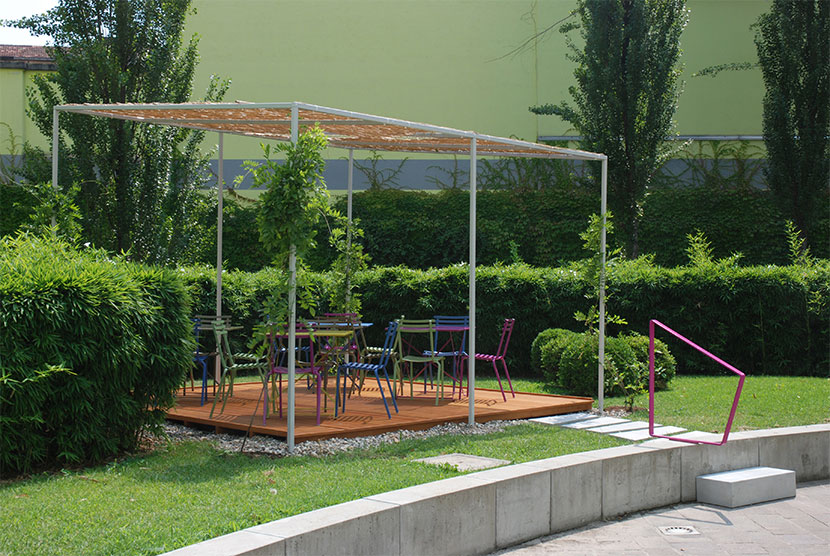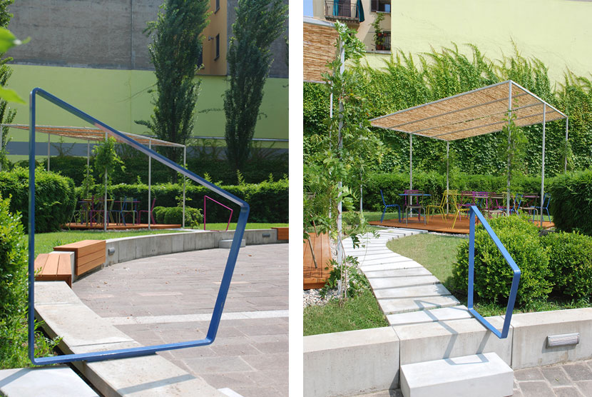 Three gazebos on a lawn, slender iron structures with a wooden floor, iron chairs, tables and handrail painted in bright colours. It is the summer garden for the employees of Intesa Sanpaolo Vita. photos Francesco Gusella