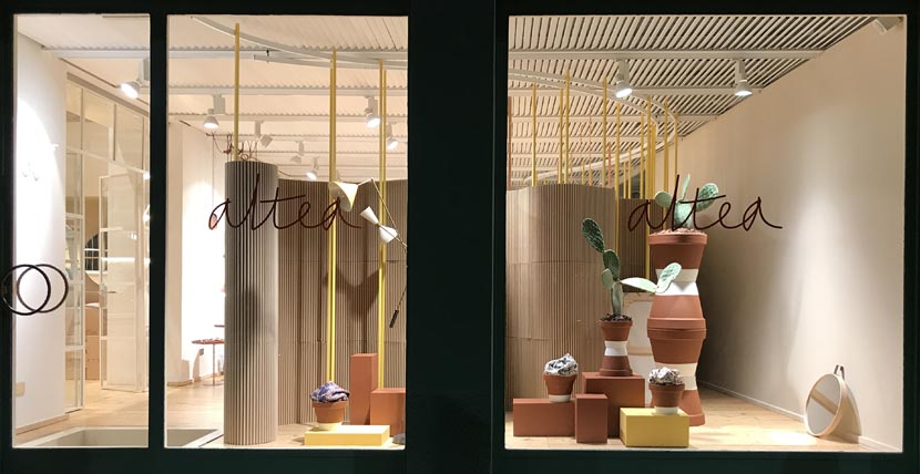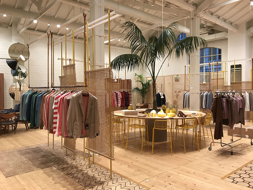 of iron uprights. The wall also defines the space of the windows dressed with cacti and fabrics from the historical archive of the brand. The panels act as backdrops to the outfits. Each area is defined by compositions of paper rugs, while to create a strong centrality in the largest area, there is a 3 m. diameter circular table made to design with a large kentia palm at its centre.