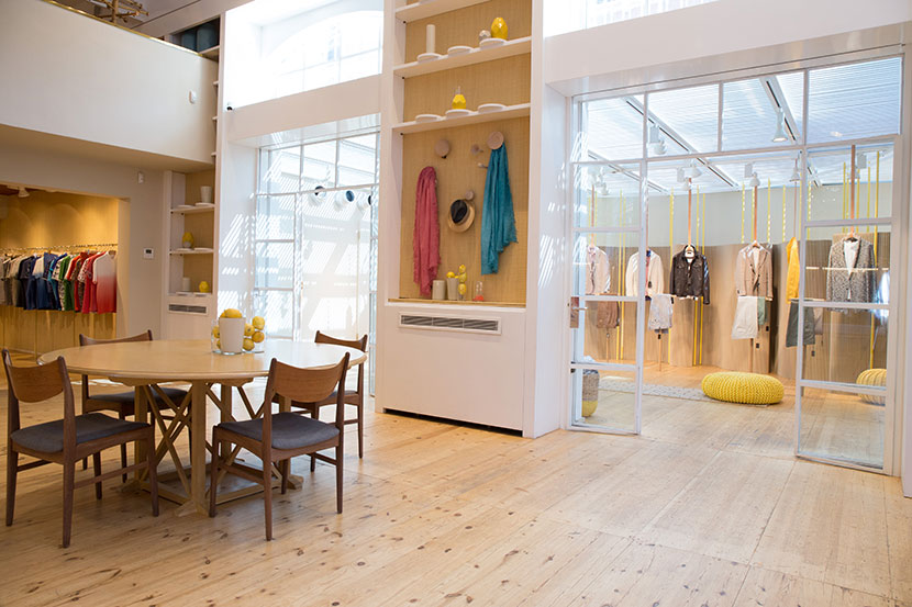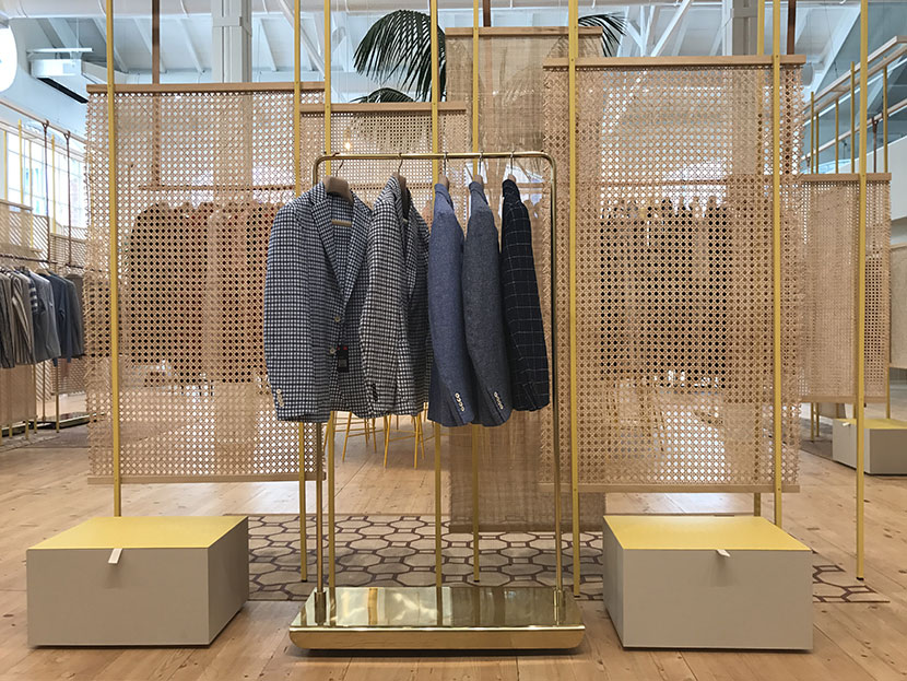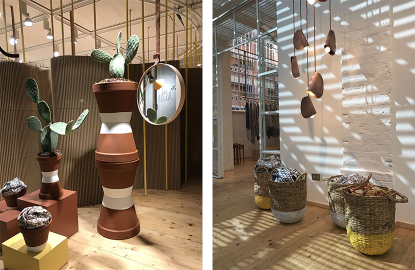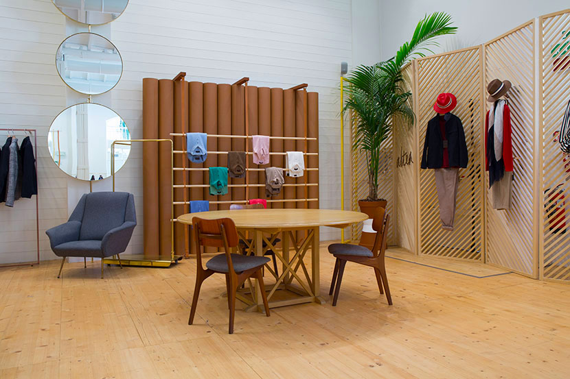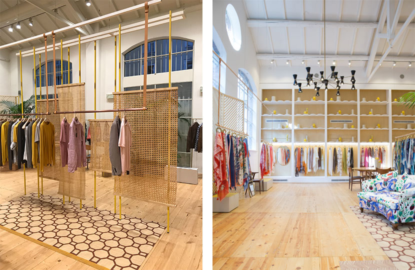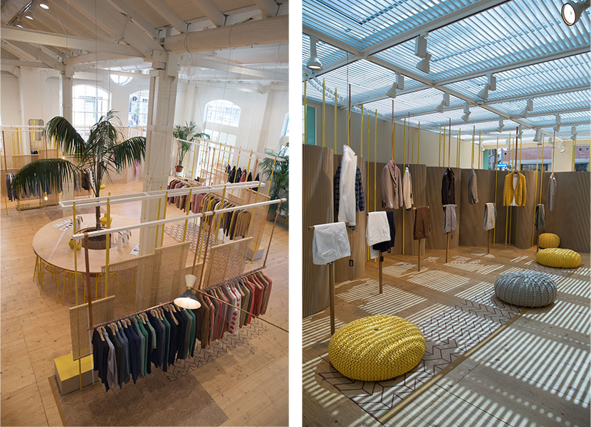 Light walls with slender yellow iron uprights and panels of woven straw act as backdrops to the various outfits. The paper rugs overlay geometric patterns in warm hues.