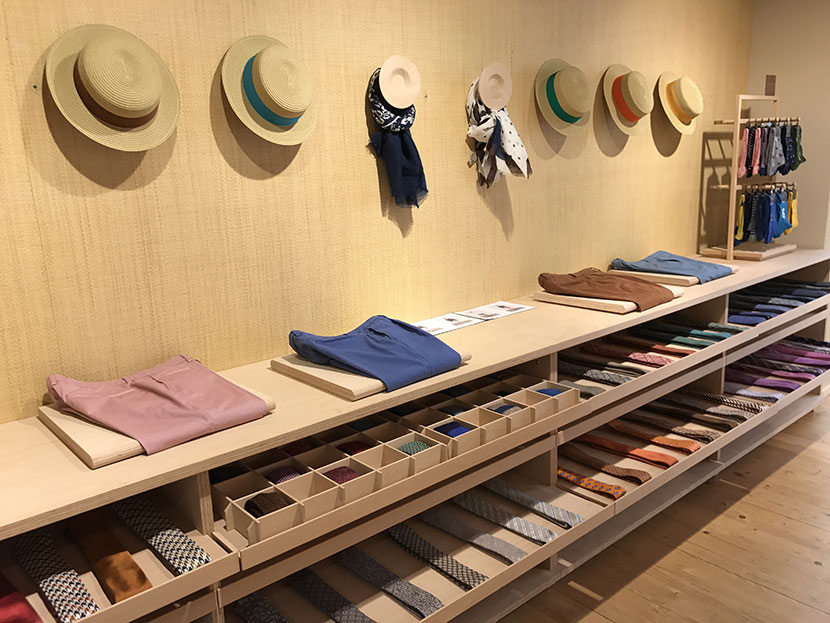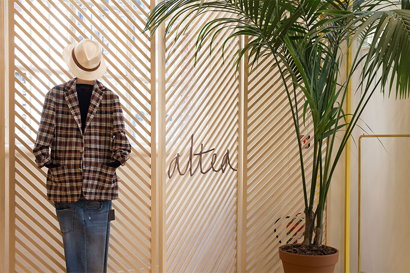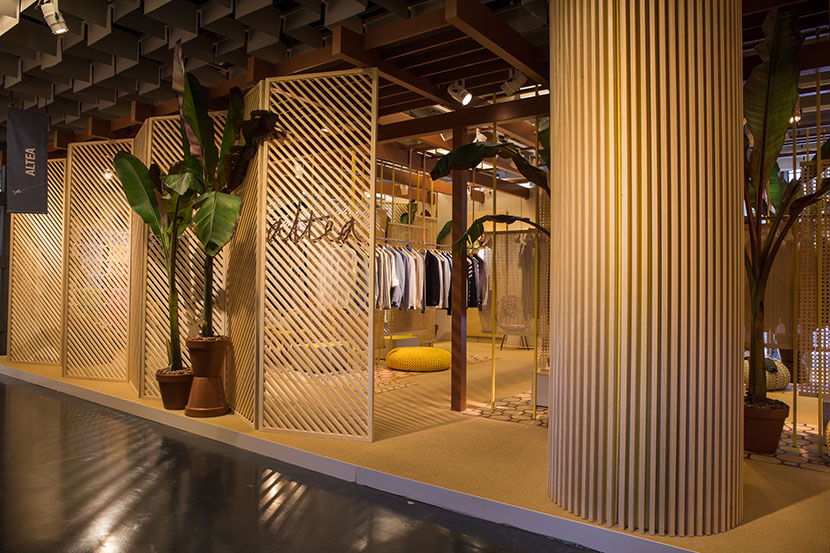 The mood of inspiration is a home overlooking the sea with influences from the Scandinavian world. The project aims at visual permeability, brightness and transparency. Natural materials such as untreated wood and woven straw have been used and, to characterize the stand, vintage furniture, printed paper fabric rugs, cottons with Nordic floral patterns and large exotic plants. The façade of the stand is made up of panels of natural wood with oblique slats that filter the light