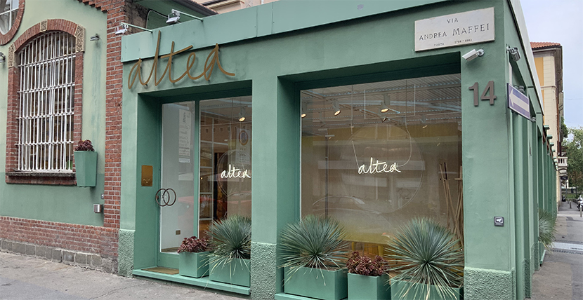 The mood of the collection speaks of nuances, evanescence and lightness. Everything seems to fluctuate in the display where the yellow of the surfaces disappears into white, the colour of the summer. The walls become a curtain with an undulating and regular geometry thanks to sheets of painted fibreglass with an opaque finish. Degradé yellow accompanies the white of the floor and the structure holding the hanging area at the centre of the stand. The whole is anchored by large cacti which filter the view and create a wall, a threshold to be crossed.