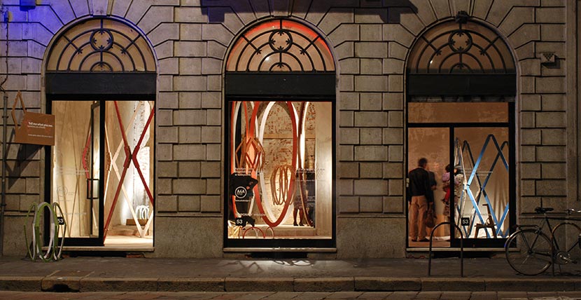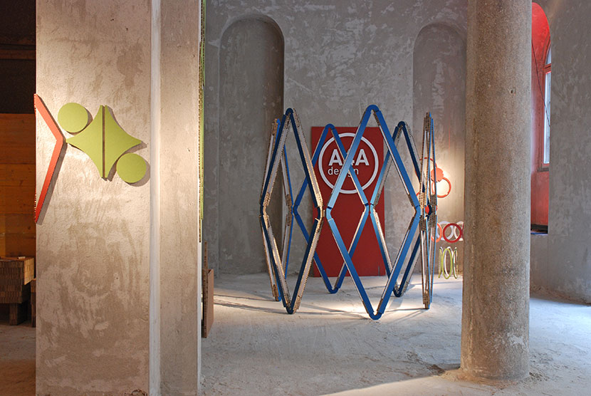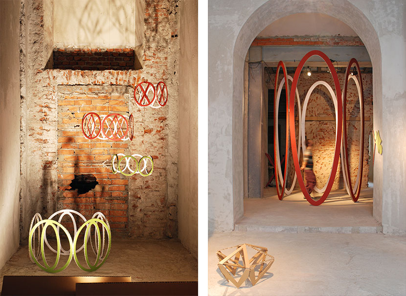Lines, parts, colours. Not yet an object. Exercises in form on the theme of the lozenge, and references to Milanese architecture of the 1930s. Curved two-dimensional elements become threedimensional. From being macro to micro dimensions, they morph into spaces you can enter (light pavilion-like structures) or into decorative forms inspired by simple figures like ellipses, circles and, of course, lozenges. The light and striking material is honeycomb cardboard.